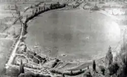 Port-Aviation had a 4-kilometre (2.5-mile) elliptical track encompassing a 3-kilometre (1.9 mi) circular grass airfield[3] and stands that could seat 7,000 spectators. When the airfield opened, it contained three marked race courses, of 1,000 metres (3,281 ft), 1,500 metres (4,921 ft), and either 1,645.6 metres (5,399 ft)[7] or 1,666.66 metres (5,468 ft),[4][8] according to different sources. A fourth course of 2,000 metres (6,562 ft) was added in the autumn of 1909.[4][7] A signals mast — sometimes considered the ancestor of the airport control tower — stood in the center of the airfield.[3] The grounds included an officials' booth at the start line for races, airplane hangars, an airship hangar, 32 repair and construction sheds, an airplane exhibition and sales hall, a central telephone and telegraph office (with a direct line to London, another to Berlin, and ten to Paris), a post office, a two-story press building, an infirmary, a hotel and reception area for distinguished visitors, a restaurant and buffet, bars, tennis courts, a car park, and the Grand Etang (Great Pond), a body of water in the eastern corner of the property that could accommodate seaplanes.[3][4][9] Structures throughout the venue were decorated with depictions of eagles, vultures, and other birds and birds of prey.[7] The Orge, a tributary of the Seine, split into two branches at the airfield, one of which ran along Port-Aviation's northwestern perimeter and the other across the northwestern, northern, and northeastern portions of the airfield itself.[4][5]