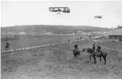 Port-Aviation subsequently drew ever-increasing and enthusiastic weekend crowds as it hosted a series of minor flying events,[4][6] and a festive atmosphere prevailed. Crowds were so large that the railway operator serving the nearby rail stations, the Compagnie d'Orléans (Orleans Company), found itself incapable of handling them — a problem which arose on 23 May[16] and continued during the season — leading to passengers waiting for hours for a train and sometimes rioting in the stations and on the trains themselves.[5] On the airfield, Delagrange, Ferber (again as "de Rue"), and Rougier raced again on 30 May 1909, competing to have the fastest lap around the same two-pylon course on which they had competed on 23 May; Delagrange, who made three flights during the day, reached an altitude of 15 metres (49 ft) on one three-lap flight and in an earlier two-lap flight reached a height of 12 metres (39 ft) and posted the winning single-lap time of 1 minute 40.6 seconds, while Ferber came in second at 1 minute 41.6 seconds.[16] From 31 May through 3 June 1909, Port-Aviation hosted the Prix Stern, a four-day competition in which pilots attempted to post the best time for one lap around a square course of one kilometre (0.62 mi) with four pylons set 250 metres (820 ft) apart; the two fastest laps both took place on the first day, when Delagrange flew at 15 metres (49 ft) and posted a time of 1 minute 18.6 seconds at an average speed calculated at 45.8 kilometres per hour (28.5 mph) and Ferber (as "de Rue") finished a lap in 1 minute 24.0 seconds, flying at an altitude of 8 to 10 metres (26 to 33 ft).[16]