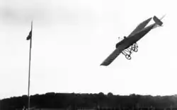 Tragedy struck at Port-Aviation on 7 September 1909, when Eugène Lefebvre, testing a Wright biplane, climbed to an altitude of 10 metres (33 ft) before suddenly pitching forward and crashing.[20] Thrown from the plane, he died in the infirmary shortly afterward without ever regaining consciousness,[20] becoming the first pilot in history to die while at the controls of a powered aircraft; whether the crash resulted from human error or a mechanical failure was never determined.[18][21][22][23] Flying continued on the field as the month continued, highlighted by tests on 16 September of a biplane with an Antoinette 24-horsepower (18-kilowatt) engine, followed that evening by a flight by Charles de Lambert of two laps of the race course, covering 7 kilometres (4.3 mi) at a height of 12 metres (39 ft) before landing in front of his hangar.[18] Another crash occurred on 20 September 1909, when a Blériot monoplane struck the stands' balustrade.[18]
