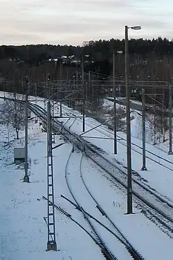 While seven out of the nine daily trains arriving from Tampere were using track 1, this train was due to arrive on track 3 because of its length.[7] However, track 3 was entered through a so-called short switch, with a maximum speed of 35 km/h (22 mph). Track 1, which had been used by all arriving trains until the end of 1997,[8] featured a long switch, with a speed limit of 80 km/h (50 mph). According to the data available from the event recorder, the driver was seemingly prepared to enter the switch leading to track 1 at 80 km/h (50 mph).[8] Even though emergency braking was initiated, it was effective for only 100 m (330 ft) before the switch.[9]