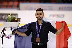 On the Grand Prix, Aymoz competed first at the 2019 Internationaux de France, where a fall on his combination attempt in the short program left him in third place, distantly behind Nathan Chen and Alexander Samarin but only a few points ahead of Shoma Uno.[13] He placed second in the free skate, behind Chen, winning the bronze medal overall.[14] Aymoz then continued this successful streak by winning silver at the following NHK Trophy and thereby qualifying for the Grand Prix Final. He was second in the short program behind Yuzuru Hanyu, making only a small error on his quad toe loop, and third in the free skate behind Hanyu and Roman Sadovsky.[15][16] Competing at the Final, Aymoz placed third in the short program, skating cleanly despite a musical mishap that initially played the music of competitor Dmitri Aliev.[17] Third in the free skate as well with only one error with a fall on an underrotated quad toe, he won the bronze medal, the first Frenchman to medal at the Final since Brian Joubert in 2006.[18]