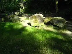 The so-called Dorfbach stream is also one of the most important spawning grounds for lake trout, although the number of spawning animals was as of 2013 very modest.[3] Some glacial erratics respectively the so-called Findlingsgarten at the lower end of the gorge towards Küsnacht, as well as the idyllic landscape, are further points of attraction. Towards Küsnacht there is the local historical museum and the historical core of Küsnacht. The museum is a former historical mill, located at the southern entrance of the ravine. The early medieval Zehntenhaus granary on the lake shore is another attraction to be mentioned.[2]
