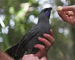 Kōkako[1] /ˈkɔːkəkoʊ/[2] are two species of forest bird in the genus Callaeas which are endemic to New Zealand, the endangered North Island kōkako (Callaeas wilsoni)[3] and the presumed extinct South Island kōkako (Callaeas cinereus).[4][5][6] They are both slate-grey with wattles and have black masks.[7] They belong to a family containing five species of New Zealand wattlebirds,[3] the other three being two species of tīeke (saddleback) and the extinct huia.[5][7] Previously widespread, kōkako populations throughout New Zealand have been decimated by the predations of mammalian invasive species such as possums, stoats, cats and rats, and their range has contracted significantly.[5][6][8] In the past, this bird was called the New Zealand crow. It is not closely related to the crow, but looks like one from a distance.[9]