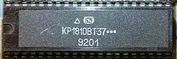 The K1810VM86 (Russian: К1810ВМ86)[1][2] is a Soviet 16-bit microprocessor, a clone of the Intel 8086 CPU with which it is binary and pin compatible. It was developed between 1982 and 1985.[3] The original K1810VM86 supported a clock frequency of up to 5 MHz while up to 8 MHz were allowed for the later K1810VM86M (К1810ВМ86M; corresponding to Intel 8086-2).[3] The K1810VM86 was manufactured plastic 40-pin dual in-line package (as KR1810VM86 / КР1810ВМ86) or in a 40-pin ceramic dual in-line package (as KM1810VM86 / КМ1810ВМ86 for the commercial version or M1810VM86 / М1810ВМ86 for the military version). A clone of the related Intel 8088 with its 8-bit bus was manufactured as the K1810VM88 (Russian: К1810ВМ88), also in plastic and ceramic packages.