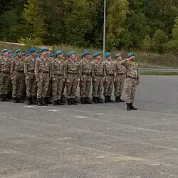 It has also participated in many joint exercises with other peacekeeping units and military units, such as the Arizona Army National Guard.[19] Since 2002, the unit has hosted the joint tactical peacekeeping exercise "Steppe Eagle" in Kazakhstan, during which it operates within a multinational force under a unified NATO-led command.[20][21][22][23][24] The battalion annually sends at least a dozen soldiers to the United Kingdom to attend the British Armed Forces Training Establishment for Peace Support Operations in the region.[25]