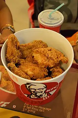 KFC's core product offering is pressure fried on-the-bone chicken pieces seasoned with Colonel Harland Sanders' "Original Recipe" of 11 herbs and spices.[59] The product is typically available in either two- or three-piece individual servings or in a family size cardboard bucket typically holding between six and 16 chicken pieces. In territories that follow the system handed down by Colonel Sanders, such as Canada and the UK, each chicken is divided into nine different cuts (two drumsticks, two thighs, two wings, two breast pieces and one keel);[60][61] however, the United States now uses an eight-piece cut.[62]