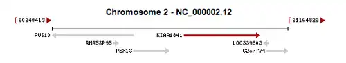Genes PEX13 and C2orf74 neighbor KIAA1841 on chromosome 2.[6]