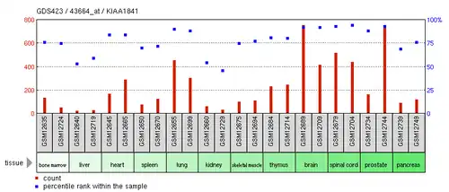 KIAA1841 is highly expressed in reproductive structures and nervous tissue. These include the brain, prostate, cervix, ear and nervous tissue. It is intermediately expressed in the lungs and spinal cord.[7][8] KIAA1841 is expressed at low levels in a wide range of tissues throughout the human body.