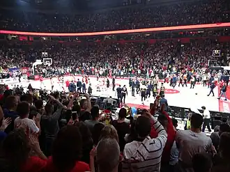 In the summer of 2014, Crvena zvezda signed Nikola Kalinić[16] and Stefan Jović[17] from Radnički Kragujevac, NBA prospect Nemanja Dangubić,[18] center Maik Zirbes[19] and finalized a huge signing of point guard Marcus Williams.[20] In season 2014–15, the club participated in EuroLeague,[21] winning 6 out of 10 games in regular season, reaching Top 16 and seeing its average home attendance rising to 14483.[22] In the Adriatic league, it set a new record of 20 consecutive victories,[23] ending league competition with score 24–2, losing only to Krka and Partizan. In the playoffs, Zvezda triumphed over Partizan 3–1 in the semifinals,[24] and 3–1 over Cedevita Zagreb in the finals,[25] winning its first trophy in this competition and securing a place in Euroleague in the 2015–2016 season. Zvezda also won Radivoj Korać Cup for the third time in a row.[26] In Basketball League of Serbia, Zvezda entered playoffs with 13 wins and only one lost game. In the semifinals, it defeated Mega Leks 2–0, and in the final triumph over great rival Partizan, 3–0.[27]