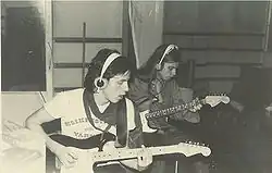Johan Johansson,[7][8] Mats Nilsson and Pekka Kangas began a band called "Ingenting" (Swedish for "nothing"). Their first and only gig was at Österholmsskolan in Skärholmen. In the autumn of 1977, most of the members of Ingenting went to Skärholmens Gymnasium, and discovered that if one worked with a project, like a band, one would not have to go to all of the classes. "Skärholmens Gymnasiums Punkensemble" was started; since many students did not want to go to class, the band quickly grew.[9] After a chaotic gig in the aula in Skärholmens Gymnasium with 15 band members, of which 5 were singers, the project "Skärholmens Gymnasiums Punkensemble" was over. The singers Stephan "Steppan" Guiance and Michael Alonzo, drummer Johan Johansson, and bassist Matte Nilsson continued and became the only constant members of KSMB, as the band was renamed in 1978. KSMB is an acronym that stands for "Kurt-Sunes med Berit", a name taken from a sketch in the radio program Hemma hos.[10]