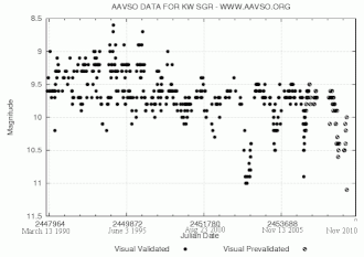 In 1942, Henrietta Hill Swope listed KW Sagittarii as a variable star.[8] It varies erratically in brightness over a range of about two magnitudes.[9] It is classified as a semiregular variable,[4] although the listed period of 670 days is poorly defined.[9] The peculiar cool spectrum has led to comparisons with symbiotic variables, but it is no longer considered to be a cataclysmic binary.[10]