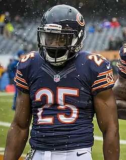 Carey was drafted by the Chicago Bears in the fourth round with the 117th overall pick of the 2014 NFL draft.[12] Carey signed a four-year contract on May 13, 2014.[13] In week 13 of 2015, Carey scored his first career rushing touchdown against the San Francisco 49ers on a four-yard run.[14] On December 27, 2015, Carey recorded his first career receiving touchdown in a 26–21 win against the Tampa Bay Buccaneers.[15]