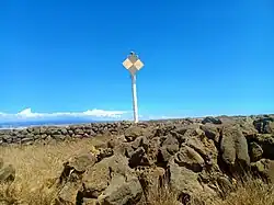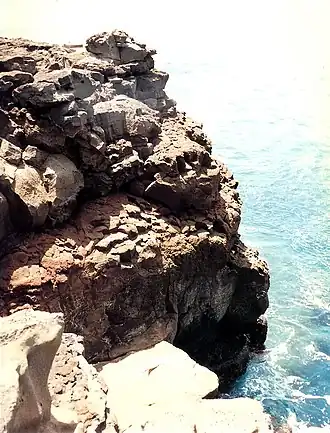 Ka Lae is the site of one of the earliest Hawaiian settlements, and it has one of the longest archaeological records on the islands.[2] It is generally thought that this is where the Polynesians first landed because the Big Island is the closest of the Hawaiian Islands to Tahiti, and Ka Lae would be the point of first landfall.[7] Ruins of an ancient Hawaiian temple (heiau) and a fishing shrine can be found here. In addition, ancient Hawaiians drilled numerous holes in the rock ledges to use for mooring their canoes. Tying long ropes to their boats, they would drift out to sea to fish without fear of being carried away by the strong currents.[8] Anthropologists from the Bishop Museum excavated the area in the 1960s.[9][10][11]