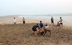 The Beach kabaddi variant is played in two 15-minute halves by two teams of four players who are not allowed to wear shoes and is played on levelled ground of sand either on seas shore or river banks.[36][37] It is played at an international level in competitions such as the Asian Beach Games.[38]