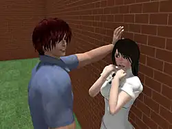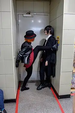 Kabedon or kabe-don (Japanese: 壁ドン; kabe, "wall", and don, "bang") refers to the action of slapping a wall fiercely, which produces a loud sound, "don". One use of this phrase is to describe the action of slapping a wall as a protest in collective housing, such as condominiums, when the neighboring unit makes too much noise.[1] Another use often appears in shōjo manga or anime when one character forces another against the wall with one hand or leans against the wall, making the "don" sound. This has become a popular tool to invoke the "clever move of confession" trope and for creating an intimate atmosphere.[2][3]