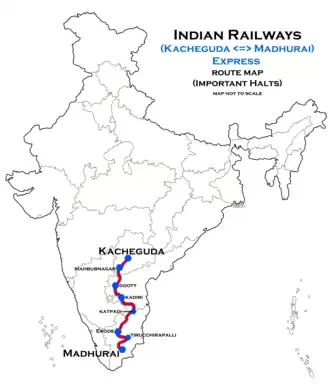 The Kacheguda–Madurai Weekly Express is a Superfast Express train belonging to South Central Railway zone that runs between Kacheguda and Madurai Junction in India. It is currently being operated with 22715/22716 train numbers on a weekly basis.[1][2][3]