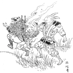 The couple had been good friends with a rabbit that lived nearby. The rabbit approached the man and told him that it would avenge his wife's death. Pretending to befriend the tanuki, the rabbit instead tortured it through various means, from dropping a bee's nest on it to 'treating' the stings with a peppery poultice that burned.