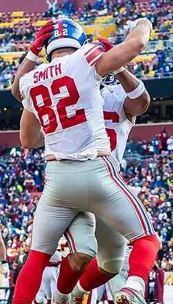On September 16, 2019, Smith was claimed off of waivers by the New York Giants.[12] During the Week 12 matchup against the Chicago Bears, Smith made his first-career start in his fourth game and recorded his first touchdown in the NFL in the 19–14 loss.[13] In week 16 against the Washington Redskins, Smith caught 6 passes for 35 yards and 2 touchdowns, including the game winner in overtime, during the 41–35 win.[14]