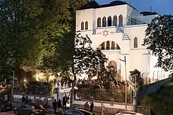 The interior is marked by an entrance space flanked by two rooms, followed by the large rectangular hall, flanked on either side by two landing steps and two accessways to further spaces.[2] The hall is the principal celebration space, with a domed ceiling, and is contoured on the upper level by a balcony with two rows of arranged chairs.[2] The remainder of the interior is decorated with Hebrew passages from the Torah, complemented by Moroccan-Sephardic decorations.[2]