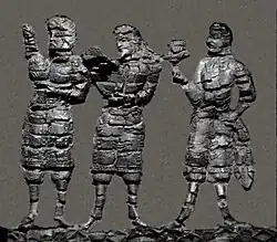 The worshippers are dressed in knee-length tunics and long boots worn over trousers - a clothing style reminiscent of that depicted in the Penjikent murals - and wear shoulder ribbons of the type associated with Hephthalite nobility.[9] The gate is dated to the first half of the 6th century CE (500-550 CE), and the destruction of the palace is attributed to the Islamic conquest of Samarkand in 712 CE. By a happy chance, the partial carbonising of the low-relief carvings has served to help in their preservation, when the aim of those who attempted to burn them was undoubtedly their destruction ( which would been achieved had they been reduced to ash, rather than effectively converted to charcoal).[9][11]
