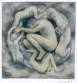 In July 1908, with Haskell's financial support, Gibran went to study art in Paris at the Académie Julian where he joined the atelier of Jean-Paul Laurens.[8] Gibran had accepted Haskell's offer partly so as to distance himself from Micheline, "for he knew that this love was contrary to his sense of gratefulness toward Miss Haskell"; however, "to his surprise Micheline came unexpectedly to him in Paris."[52] "She became pregnant, but the pregnancy was ectopic, and she had to have an abortion, probably in France."[8] Micheline had returned to the United States by late October.[8] Gibran would pay her a visit upon her return to Paris in July 1910, but there would be no hint of intimacy left between them.[8]