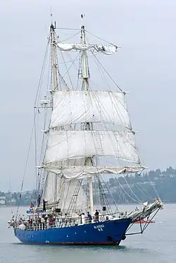 STS Kaisei (海星), meaning “Sea Star” in the Japanese language, is a steel-hulled brigantine designed by Polish naval architect Ryszard Langer. It was built as a schooner in Elbląg, Poland in 1987. After re-rigging it is now a two-masted vessel, square rigged on the foremast, with fore-and-aft sails on the mainmast.