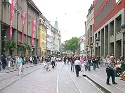 The street begins in the north of Freiburg at Siegesdenkmal, which is located on the outskirts of the historic city center. From the central street crossing, at Bertoldsbrunnen, Bertoldstraße branches off westwards and Salzstraße eastwards. On the southern outskirts of the historical city center Kaiser-Joseph-Straße passes through the Martinstor gate and continues on to Kaiserbrücke, which crosses the Dreisam. Like many other streets in downtown Freiburg, Kaiser-Joseph-Straße has a Bächle. Most of the buildings between Siegesdenkmal and Martinstor were completely destroyed in World War II during an air raid on 27 November 1944. Because of the tram, which opened in 1901, the people in charge had to build arcades into the buildings on either side of the street in order to create more space for pedestrian and other traffic, so the tram could continue passing through the Kaiser-Joseph-Straße. Traffic was regulated by traffic lights located at Bertoldsbrunnen.[2] In November 1972,[3] the street became one of the first traffic-calmed areas for pedestrians in Germany. Only tramline 2 (Zähringen-Günstertal), tramline 3 in the south (Vauban-Haid), as well as tramline 5 (Rieselfeld-Hornusstraße) and certain delivery vehicles are allowed to use this street now. These restrictions do not affect the part of Kaiser-Joseph-Straße which is located south of Martinstor.