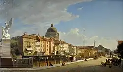 After the death of Wilhelm I in the Year of Three Emperors (1888) an open competition for the establishment of a national monument in his memory was tendered the next year. The first competition, in which the architect Bruno Schmitz with the draft "Imperial Forum" was chosen,[1] did not bring the desired results. So in 1891 a second, limited bid to only eight selected artists was tendered. The construction base of the monument was laid down on the west side of the City Palace, along the Spree Canal. The design of Reinhold Begas and Gustav Halmhuber was eventually chosen.