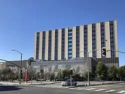 To meet California's updated earthquake safety standards, the Oakland Medical Center was replaced in stages. First, a new parking garage opened in 2011. This was followed by a new twelve-story, 349-bed full service hospital across the street from the old facility. The new hospital is on the site of the MacArthur/Broadway indoor shopping center, opened in 1965 and demolished in 2009.[5] The new Oakland Medical Center features twelve inpatient operating rooms, six outpatient operating rooms and seven outpatient procedure rooms, eight delivery rooms, and an emergency department. There are single occupancy rooms only (previously, patients shared rooms). Every patient has a private room with room service, free Wi-Fi access and a pull-out guest bed. A 42-inch flat-screen monitor in each room allows patients to watch TV, and also to look up the names of doctors and nurses, have a remote conversation with an interpreter and see their treatment plan. The hospital building is complemented with a four-story medical office building hosting ninety-nine provider offices. These additional buildings opened in July 2014; the Oakland Medical Center, the flagship facility of the entire Kaiser Permanente system, is one of three new Kaiser hospitals that began operating that year. A new hospital in suburban San Leandro opened in June, and the Redwood City medical center opened in December.[6] [7] [8]