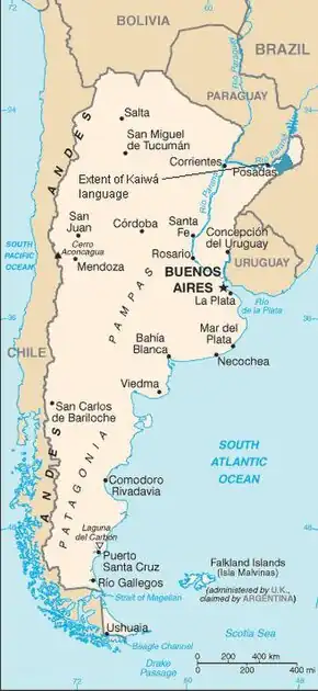 Extent of the Kaiwá language in the northeast Argentine panhandle shown in teal. | |