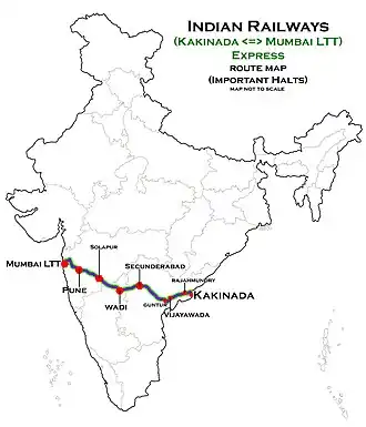 It operates as train number 17221 from Kakinada Port to Lokmanya Tilak Terminus and as train number 17222 in the reverse direction serving the states of Andhra Pradesh, Telangana, Karnataka and Maharashtra.[2]