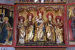 Late medieval depictions of a female saint, typically equipped with a spindle and spinning, and with rats either on the thread, on the saint or in the surroundings, are known from the Swedish churches of Film, Forssa (vanished), Harg, Kaga, Njutånger as well as possibly Viksta, and Hattula in Finland.[1][2][3] Some of these also have speech scrolls identifying the saint. Similar depictions are also known from Germany, including on an altarpiece in the monastery of Adelberg, Baden-Württemberg under the name Cutubilla. A woodcut from the middle of the 15th century in the Kupferstichkabinett in Berlin also depicts the saint, and may indeed be indicative of how depictions of her were spread to Sweden, using early printing techniques.[4] A large number of variations of the saint's name are known. From Sweden, the forms Kakwkylla, Kacacila, Kakitkaina, K(akuk)olla (possibly), and Katakyla (possibly) are known. From German sources, the names Cakukilla, Cutubilla (or Cutubilla von Württemberg),[5] Kakukabilla, Kakukilla and Kukakille have been identified.[1]