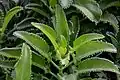 It is often misidentified as one of its putative parents, K. daigremontiana, which has bands or spots on the back of leaves, while the leaves of K. laetivirens are completely green, as indicated by its epithet laetivirens which means "lushly green".[3]