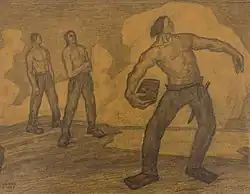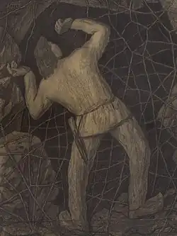 Kalevipoeg travels to Finland in search of his kidnapped mother. During his travel he purchases a sword but kills the blacksmith's eldest son in an argument. The blacksmith places a curse on the sword. On returning to Estonia Kalevipoeg becomes king after defeating his brothers in a stone hurling competition. He constructs towns and forts and tills the land in Estonia. Kalevipoeg then journeys to the ends of the earth to expand his knowledge. He defeats Satan in a trial of strength and rescues three maidens from hell. War breaks out and destruction visits Estonia. Kalevipoeg's faithful comrades are killed, after which he hands the kingship to his brother Olev and withdraws to the forest, depressed. Crossing a river, the sword cursed by the Blacksmith and previously lost in the river attacks and cuts off his legs. Kalevipoeg dies and goes to heaven. Taara, in consultation with the other gods, reanimates Kalevipoeg, places his legless body on a white steed, and sends him down to the gates of hell where he is ordered to strike the rock with his fist, thus entrapping hell in the rock. So Kalevipoeg remains to guard the gates of hell.[5]