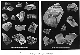 The excavation unexpectedly brought to light a twofold sequence of cultures, of which the upper one (Kalibangan I) belongs to the Harappan, showing the characteristic grid layout of a metropolis and the lower one (Kalibangan II) was formerly called pre-Harappan but is now called "Early Harappan or antecedent Harappan".[8] Other nearby sites belonging to IVC include Balu, Kunal, Banawali etc.