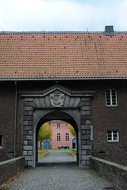 The lords of Kalkum rebuilt their burnt-down manor house after the end of the feud. A map from around 1600 shows it as an ensemble of three houses connected by corridor-like buildings, which were surrounded on all sides by a common moat.[16] However, the estate did not remain in the possession of the lords of Kalkum for much longer, as the line of Kalkum died around the middle of the 15th century.[16] Around the middle of the 15th century, the male line of the family based in Kalkum died out and the castle was inherited by the von Winkelhausen family, whose ancestral seat, the Haus Winkelhausen, was located a few kilometers north of Kalkum.[16] It is still not clear exactly when this happened. There is documentary evidence that Grete von Kalkum gave her estates in parish Kalkum to Hermann von Winkelhausen in 1443. This could also have included the Kalkum house.[17] There is evidence that the castle was owned by Winkelhausen in 1465, as in that year Herrmann von Winkelhausen designated Kalkum as a widow's residence for his wife Agnes on October 27.[18] In the 17th century, the estate was also used several times to provide for widowed members of the family. After inheriting the estate in the 15th century, the von Winkelhausen family moved their permanent residence to Kalkum. Around 1500, the owner was Johann von Winkelhausen. The estate passed from him to his son Ludger and finally to his nephew of the same name in 1556. This Ludger von Winkelhausen was jülich-Berg councillor, equerry and marshal as well as bailiff of Hückeswagen, Bornefeld and Mettmann.[12][19] In 1553, his family was also elevated to the baronial rank by privilege of Emperor Ferdinand III.[20]
