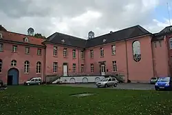 After the extensive work in the 1950s and 1960s, the castle saw only comparatively minor conservation measures. These included the renewal of the exterior paintwork between 1980 and 1981 and, in 1995, the re-excavation of a small park pond to the north of the Rentei und Domestikenflügel, which had previously been located there.[69][83] In addition to the Rhineland Department of the State Archives, Kalkum Castle has also housed part of Vester's Archive, Institute for the History of Pharmacy since 1970,[84] a collection founded in 1937 by pharmacist Helmut Vester . The part stored in Kalkum included a specialist library on the subject of pharmacy as well as pictures and maps of pharmacies and their history. In addition, there were around 400 display jars filled with raw drugs.[85] In 1993, Vester's archive moved to Switzerland to the Pharmacy History Museum of the University of Basel.[86]
