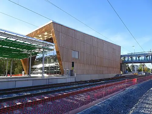 The architectural design of the new station was done by Rundquist Arkitekter, including the adjacent bus terminal, bridge, platform shelters, and station furniture.[4] The station and bus terminal are clad in Siberian larch wood, both internally and externally.[5] The pedestrian bridge is 40 meters long and weighs 129 tons, pre-fabricated in sections and lifted into place.[6]