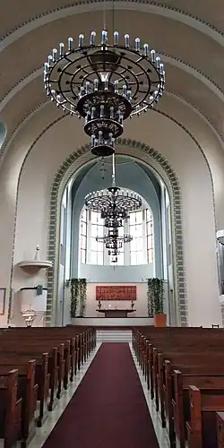 The interior of the church is decorated with Christian symbols such as roses, lilies, palm branches, laurel crowns and pearls to pass on the message of the Gospels. There are also Art Nouveau murals inside the church. The altarpiece is a wooden relief ‘Tulkaa minun tyköni’ (‘Come to me, all you who are weary and burdened’) by Hannes Autere, carved in 1956. In the vestibule of the church and in the organ galleries there are four plaster reliefs from Sigrid af Forselles’ five-part series Ihmissielun kehitys (‘Development of the human soul’). In the sacristy there's a painting by Verner Thomé, depicting Jesus healing a blind man.