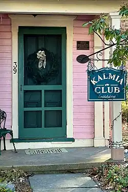 The club was established in 1892 by a group of local women and was first known as the Reading Circle. They discussed literature and cultural topics, led by their first president, Elie Erismann. In 1893, they started holding their meetings at 39 York Street and changed their name to the Kalmia Club, after the botanical name, Kalmia latifolia, of the mountain laurel.[3][10] The club became a member of the New Jersey State Federation of Women's Clubs in 1897, and is also a member of the General Federation of Women's Clubs.[4] In 1995, they published the Lambertville Community Cookbook to raise funds for their community service projects, including scholarships for local young women.[11][12] In 1996, they started the annual Hidden Gardens of Lambertville tour to raise funds for community projects.[13][14]