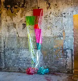 Kaloust Guedel's work explores contemporary issues often taking a critical stand on various societies shortcomings. Throughout the years, it has explored subjects as genocide, war, abuse and others.[8] Regardless of the styles and technics he has employed, his work has been consistent with contemporary sensibility and has reflected the consciousness of its time. Guedel is the first artist who used vinyl as a medium in paintings. He has been featured in publications like Masters of Today and has been known to explore capitalism and excess in his minimalist conceptual artworks.[9]