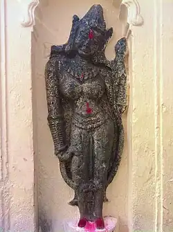 According to the Kalika Purana, Kamakhya Temple is the place where her yoni (genitals and womb) fell after Shiva's tandav (dance of destruction) with the corpse of Sati.[56] This is not corroborated in the Devi Bhagavata, which lists 108 places associated with Sati's body, though Kamakhya finds a mention in a supplementary list.[57]