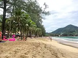 It is situated north of Patong, about 8 km, and at a distance of about 45 minutes from Phuket Airport via car. It has a long sandy curvy stretch of 3 km and usually a quiet atmosphere.[4]