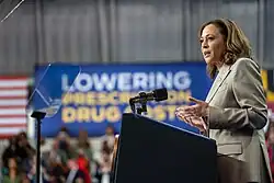 Harris framed her campaign as "a choice between freedom and chaos" and based it around the ideals of "freedom" and "the future".[148][149] The Harris campaign sought to highlight her experience as an attorney general and a prosecutor to "prosecute the case" against Trump by pointing out his 34 felony convictions.[150] Harris ran as a moderate Democrat and moderated several of her policy positions since her 2019 run, with many of her domestic policy stances resembling Biden's.[151][152][15] Harris's stances also had a particular focus on reproductive healthcare.[15]