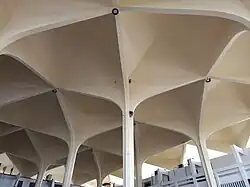 The entire structure consists of 36 squares. It has a total of 49 columns. Above it stands a roof with 36 slender concrete domes. Each column, 59 feet high, extends four branches upward and supports the roof. The station is spread over an area of 156 acres. It has 11 ticket counters and several passenger rest areas.[34]