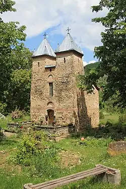 In terms of architecture, the church features a round dome and a single apse. The naos or cella has the shape of a cross, in line with the popular Byzantine cross-in-square design.[1][7][8] Of particular interest is the formerly two-storey narthex, which is notable for its unusual verticality and the towers on either side of the entrance. Judging by the models depicted in the donor's portraits inside the church, it is clear that the towers were originally further apart and the west facade with the narthex included much woodwork.[6][9] The towers are topped off by sharp-pointed pyramidal elements, with additional sharp-pointed details in each of the pyramids' four corners. The towers and their design are entirely unusual and unprecedented in medieval Bulgarian church architecture.[1] Art historian Nikola Mavrodinov believes these resemble Gothic architecture, though a more modern researcher, Bistra Nikolova, dismisses his assessment and considers these an influence from Hungary or Transylvania.[1]