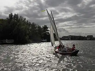 The Kamer 2 Sailing Marathon was a 50 kilometer steeplechase type regatta for sloops in the lake district between Amsterdam and Leiden in The Netherlands. The race is held each year in September and attracts some 70 participants. Boats can be crewed by a team of three or, for all female teams, four. The race leads from the Kaag Lake through Does and Wijde Aa to the Braassemermeer and from there through the Ringvaart to the Westeinderplas. There a turning point is situated directly beneath the watertower of Aalsmeer from where the race goes back along the Ringvaart to the Kaag Lake.