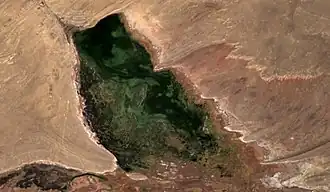 The lake is located 30 kilometers (19 mi) to the ESE of Ulanbel village. The ruins of ghost town Kishi Kamkaly, abandoned in 2019, lie by the northern end of the lake. The lake water is used for watering livestock grazing in the surrounding area.[1][2][3]