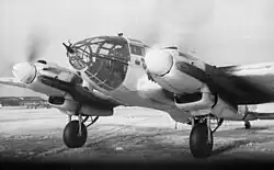 The opening day of the campaign resulted in the loss of seven aircraft.[62] III. Gruppe attacked airfields at Łuck and Mlynow, near Dubno.[61] The next day an 8./KG 55 Heinkel was shot down by flak over Łuck, the crew bailed out but were later found by advancing German forces to have been shot in the head. Two of the men were found at the local Commissar's house.[62] II. Gruppe attacked airfields in L'vov, Adamy, near Busk, Ukraine, and Zalosy. III./KG 55 bombed airfields in Dubno and Kiev that morning. The Luftwaffe established a degree of air superiority after destroying and capturing over 4,000 Soviet aircraft in the first weeks of the invasion.[63] II./KG 55 attacked airfield near Kiev again on 25 June while III. Gruppe bombed Red Army troop concentrations in Wlodzimierzec-Lutsk area on 23 June followed by bombing attacks on the Kowel-Sarny rail system on 25 June.[61] By 25 June Fliegerkorps V bombed 77 airfields in the first three days, in 1,600 sorties.[64] The air corps claimed 774 Soviet aircraft on the ground.[64] Army reconnaissance units and the air corps lost 55 aircraft destroyed and 37 damaged.[65]