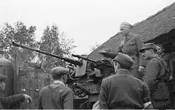 With the cessation of the Soviet Union's offensive on the Warsaw front and the waning of the uprising, the German command concluded that the time was ripe to liquidate the Kampinos Group.[249] In the anti-partisan operation, codenamed Sternschnuppe (Falling Star"), a combined tactical group under the command of General Friedrich Bernhard took part, equipped with artillery, armored vehicles, and air support. Tadeusz Sawicki assessed that the total strength assigned to crush the Kampinos Group exceeded, in terms of numbers and armament, the structure of a regular infantry division.[250][251] The beginning of Operation Sternschnuppe took place on September 27, when the Germans struck at Polish positions in the eastern and south-eastern parts of the Kampinos Forest. Fierce battles took place in the area of Brzozówka, Janówek, Pociecha, and Zaborów Leśny.[252][253][254] On that day, German Air Force also carried out a raid on the headquarters of the Kampinos Group in Wiersze.[251][255]